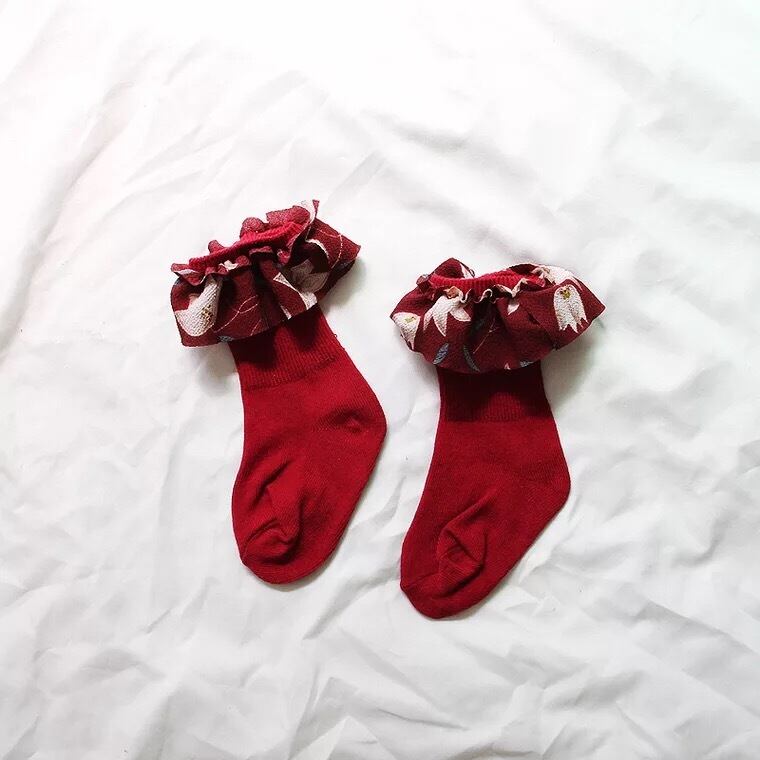 インポート♪花柄フリル付きキッズソックス♡靴下 タイツ 女の子用 赤